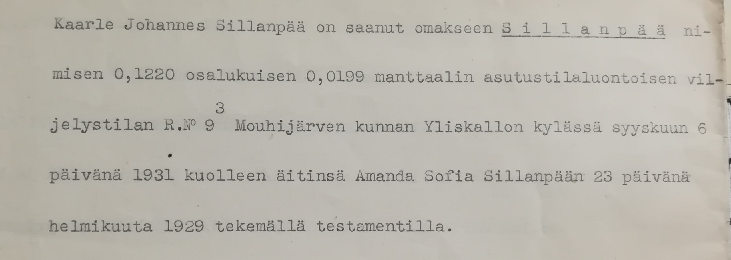 Katselin vielä henkikirjoja 1920 ja 1921. Leskiäiti Manda Sillanpäällä on oma asunto, mutta Kalle Sillanpäällä ei. Vaikuttaa siis siltä, että äiti oli mäkitupalainen ja poika työmies, joka mahdollisesti asui lapsineen äitinsä mäkituvassa.