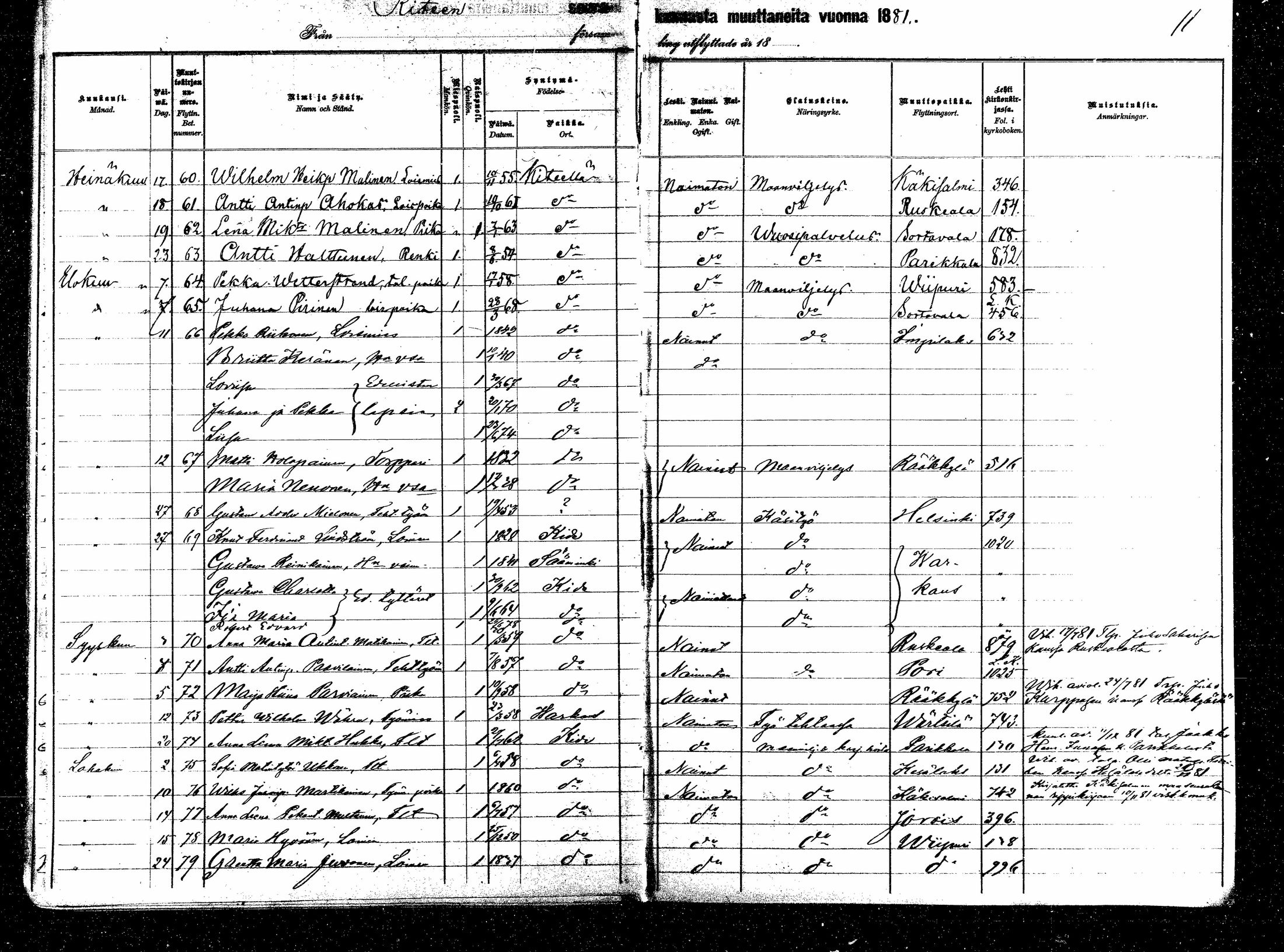 Kitee , Muuttaneet, 1880-1884