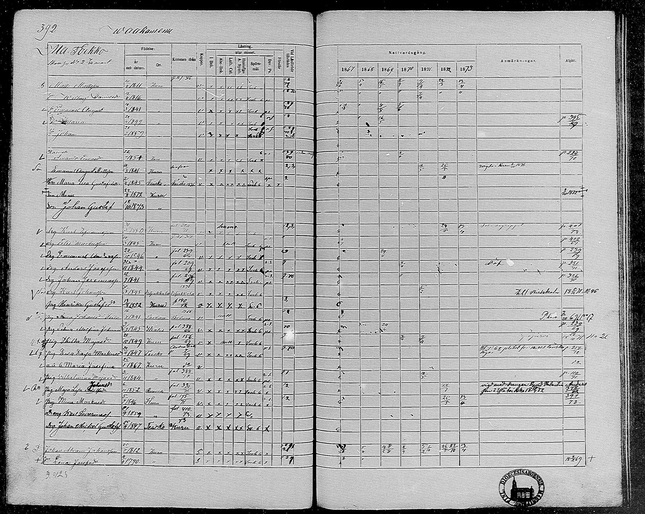 Kuru , Rippikirja, 1867-1873