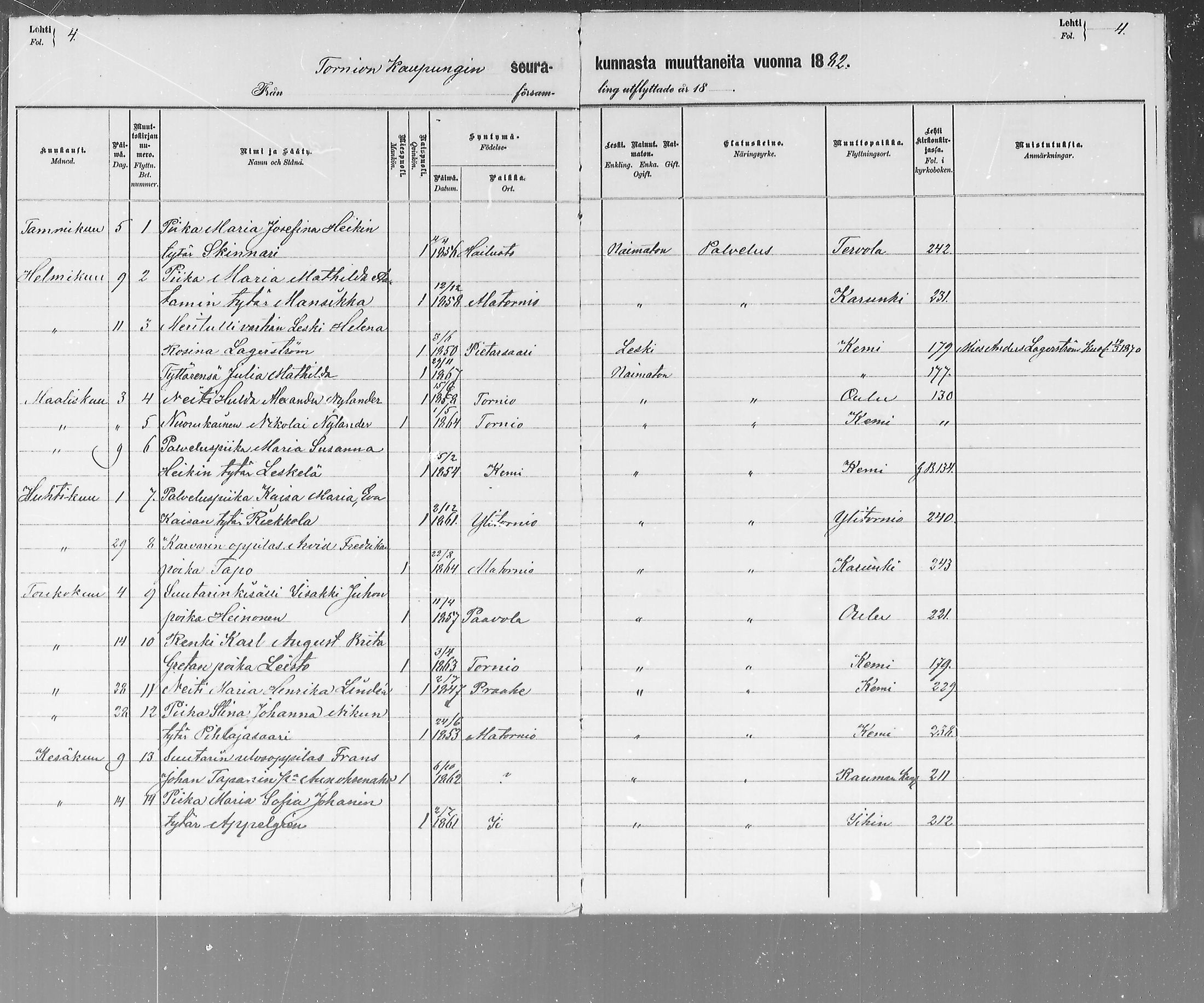 Tornio , Muuttaneet, 1881-1883